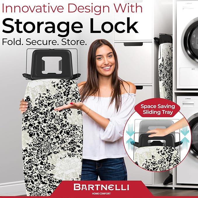 - CUSTOMIZE TO YOUR HEART'S CONTENT – HEIGHT & STORAGE, SOLVED! What if your ironing board could fit you perfectly and vanish out of sight when not needed? Say hello to adjustable heights and easy folding with a secure lock for storage. Tailor it to your comfort, then tuck it away without a second thought. Finally, a board that adapts to your life, not the other way around. Comfort and convenience? Check and check!