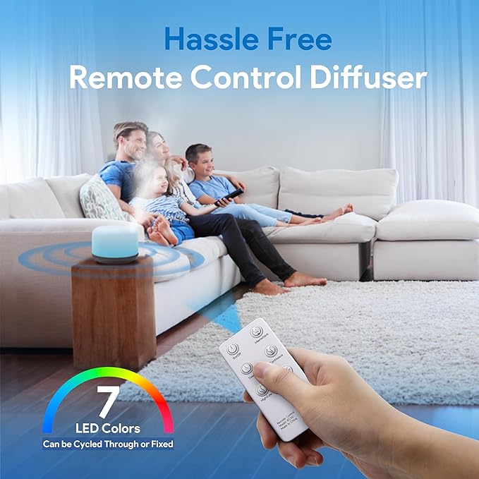- 5-IN-1 AROMATHERAPY DEVICE: This ultrasonic essential oil diffuser is an amazing multi-functional aromatherapy device unlike any other you've ever used. It features a large and easy to clean 500ml water tank, 7 LED light colors, multiple mist nebulizer modes and remote control, as well as a safety auto-switch that prevents it from overheating in case it runs out of water.