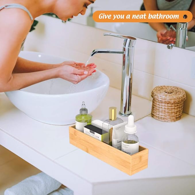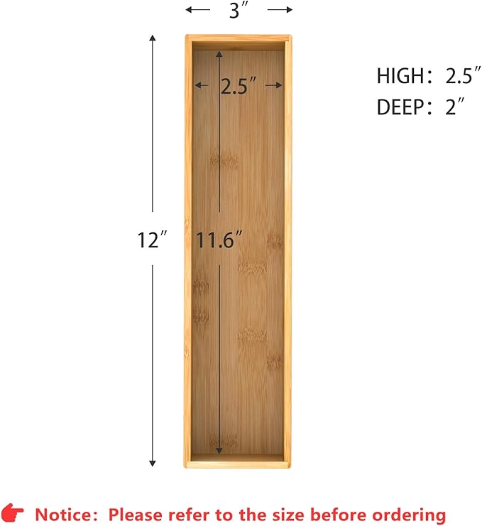 - 【Multi-functional Storage Box】 This deep bamboo organizer boxes are good for organizing items, such as forks, spoons, and knives in kitchen; brushes, soap dispenser and toilet paper in bathroom; cosmetics, makeup tools and hair accessories in makeup room; documents, pens and paper clips in office. Try this bamboo storage box organizer - ending clutter in your office desk and kitchen drawer.
