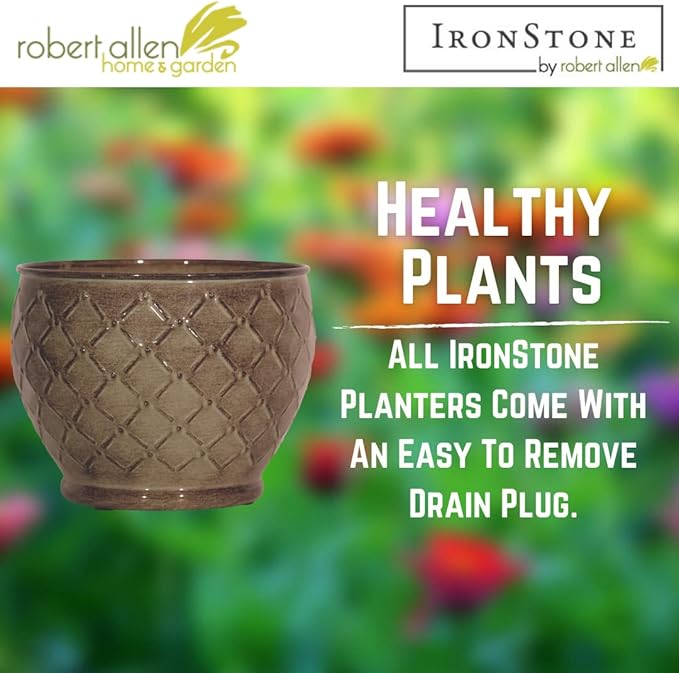 - -DRAINAGE – Contains a removable drain plug. Each IronStone planter comes with a drain plug that proves very useful whether inside or out during the changing seasons.