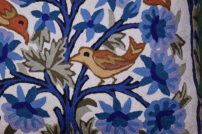 Blue Tree of Life Pillow Cover Blues Birds Floral Decorative Pillowcase Flower Outdoor Suzani Cushion Needlepoint Hand Embroidered Wool Size - 18x18