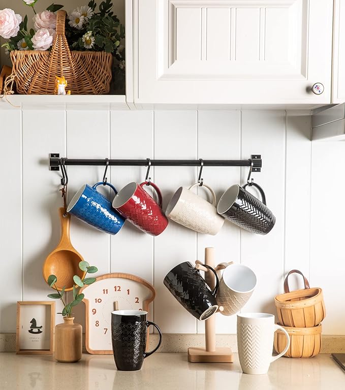 - LARGE OPEN HANDLE AND STYLISH DESIGN: These coffee mugs features a large open handle that provides a comfortable and secure grip. The handle remains cool even after microwaving, and the beverages stay warm. The smooth rim of the mug ensures a comfortable drinking experience. Designed by professional artists, these mugs with geometric relief patterns not only look fantastic on your table but also add a touch of style to your kitchen.ying about spills. This mug is not just for coffee - it's also great for tea, soup, beer, cocoa, and more.