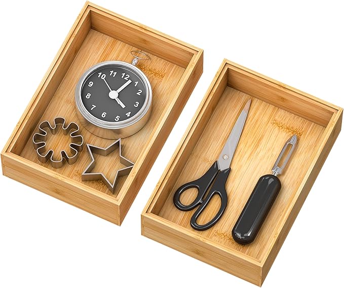 - 【Sturdy Wood Drawer Organizer Storage Box】 Bambloom bamboo utensil drawer organizers are made of 100% bamboo,solid,durable, light and beautiful. It has no odor and smooth texture; compare with plastic,bamboo drawer storage boxes is a renewbale. Easy to Maintain,just wipe these small drawer organizers with a damp cloth and a mild cleaner.