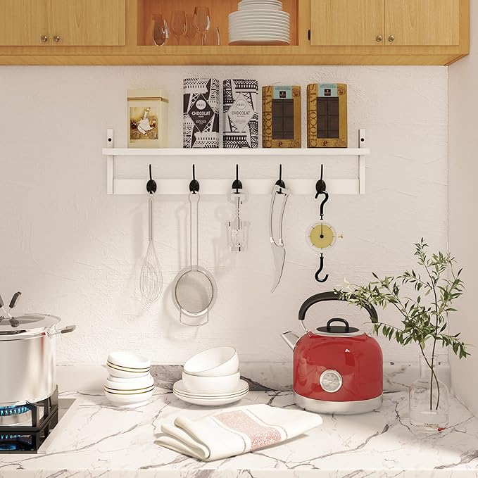 - Multipurpose Storage wall mounted coat rack Shelf: You can use coat rack wall to organize and store bathroom accessories in the bathroom, and hang bathrobes and towels; You can use it in the kitchen to store spices or condiments and hang an apron; You can use coat rack with shelf in the kitchen, bathroom, bedroom, doorway entrance or any space that requires additional storage solutions