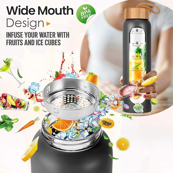 Aqulea Glass Water Bottles with Silicone Sleeve - BPA Free Reusable Wide Mouth Glass Motivational Water Bottles with Fruit Infuser – Leak Proof Borosilicate Water Bottle with Time Marker