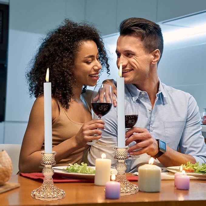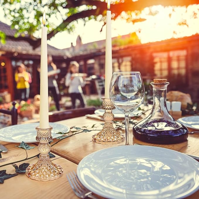 - ❤️Candlestick Holders Set❤️ -- Universal Taper Size: Top inner diameter 0.78'', bottom diameter is 3.15''x 4''H. They fit most standard taper candles, chime candles and flameless LED candles. [NOTE]You wanna candles stands straight? Melt the bottoms of the candlesticks into the holder and hold it in place for 10sec!