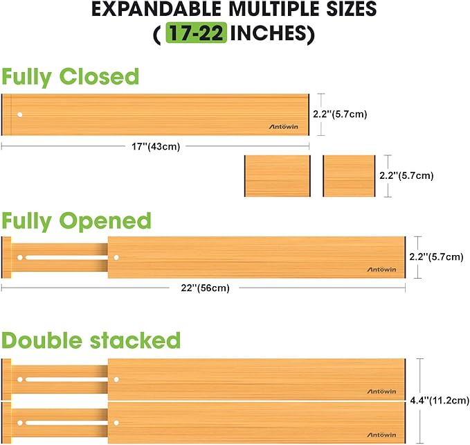 - ORGANIZED DRAWERS: The drawer dividers from ANTOWIN are the best way to avoid a mess in the kitchen, bathroom, bedroom or elsewhere in your home or office. These bamboo drawer separators will help you keep everything organized and tidy at all times!
