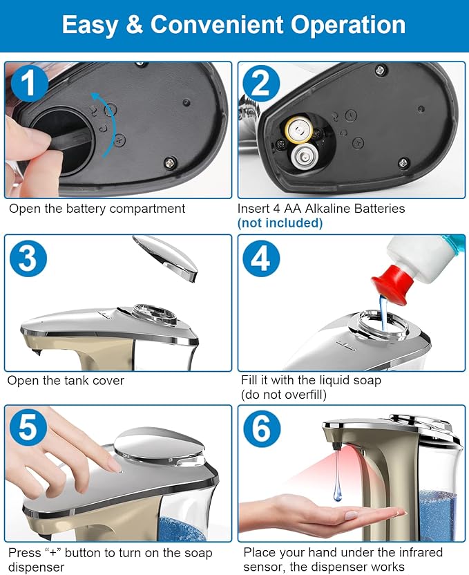 - [Wide Compatibility Soap Dispenser] This touchless soap dispenser operates on 4 AA Alkaline batteries (not included), which can be used in any occasion without limits on the power outlet. Suitable for multiple occasions, such as home, hotel, school, office, and other places. We will provide 2-year quality assurance and lifetime professional service, please reach out to us if any help is in need.