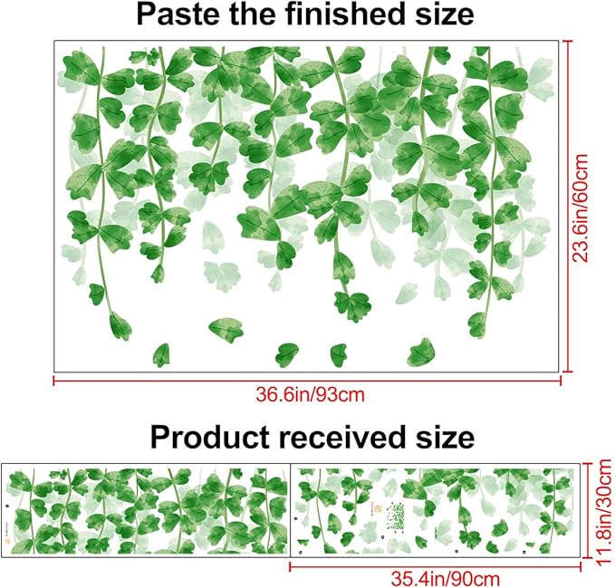 - The green vine decals on the wall is really great decorations for any smooth wall or window decorations, holiday party supplies. Add some color to your room, create a cute and lively atmosphere. Finished Size: 36.6” x 23.6” / 93cm x 60cm. This green vine leaf wall decals include 2 sheets. Each size: 12” x 36” / 30cm x 90cm.