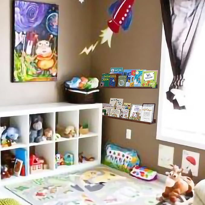 - Deep Walnut Wall Ledge Book Shelf:The size of photo ledges is 48in x 4.5in x 2in,Wall shelves are made of natural wood which is healthy and tasteless. So they are sturdy enough to hold your favorite collections, family photos (as picture ledge shelf), kids’ books, decorative items, cosmetics or green plants.
