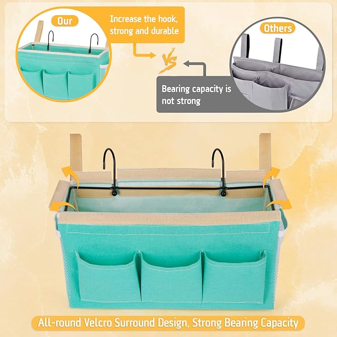 - 【Wide Application】Keep your items close to you for convenient access. The bunk bed storage caddy stores all your belongings together, such as laptop, mobile phones, books, water bottles, data cables, etc; Suitable for home school dorm bunk beds, hospital bed rails, crib rails or camping.