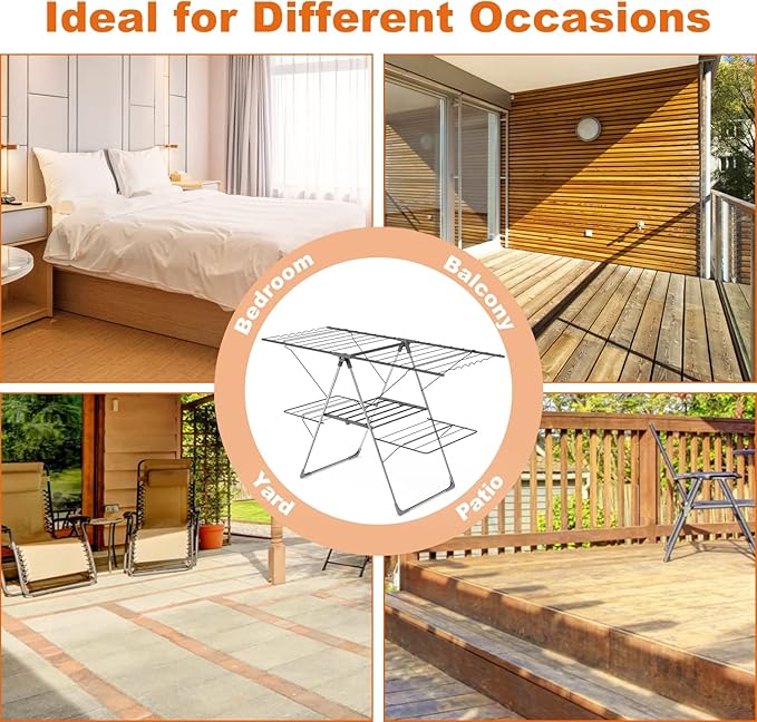 - đăAdjustable Height for Versatile Dryingă Our Drying Rack's (up to 62 inch) accommodate long garments like coats, dresses, and curtains without dragging on the ground. Ideal for indoor or outdoor use!