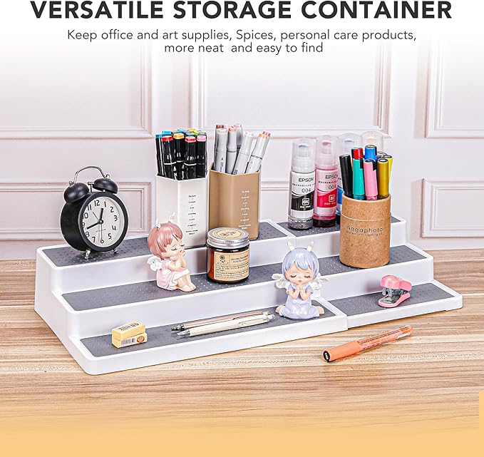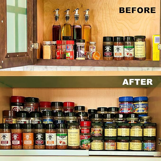- Stepped Design - Our spice organizer has a stepped design to make it easier to find the herbs and seasonings.his tier spice rack can be used not only to store spices but also to organize and declutter your bedside drawer, your bathroom cabinet, your work desk, and even your other kitchen cabinets.