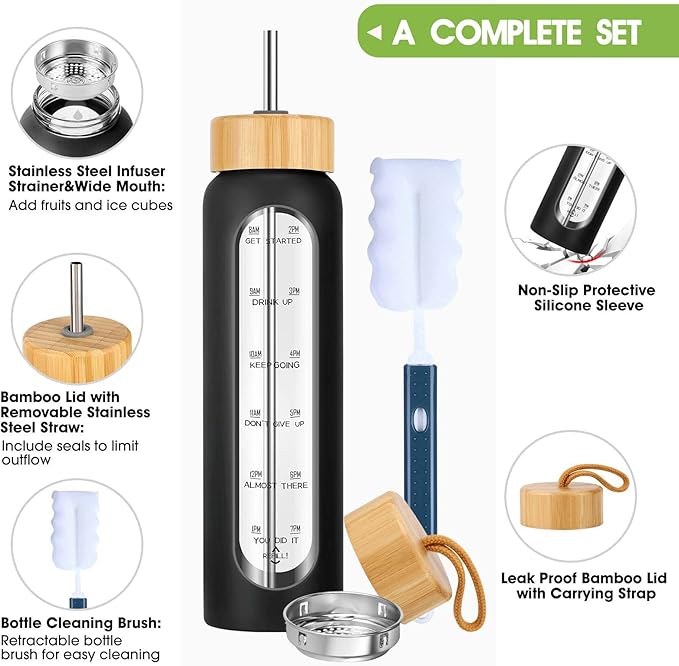 - Infuse Your Beverage - Use the stainless-steel infuser to strain fruits or herbs in our reusable glass water bottle 32oz with time marker for a delicious and healthy way to flavor your water. Silicone sleeve adds style and provides protection from slips and falls