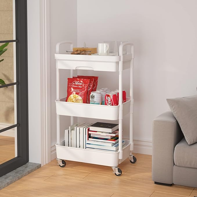 Calmootey 3-Tier Rolling Utility Cart with Drawer,Multifunctional Storage Organizer with Plastic Shelf & Metal Wheels,Storage Cart for Kitchen,Bathroom,Living Room,Office,White