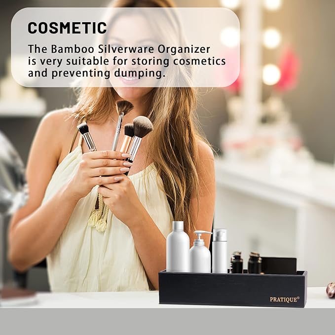 - PRACTICAL STORAGE SPACEPRATIQUE drawer organizer can reduce clutter and avoid desperately searching for lost items. Ensure drawers in the kitchen and beyond are neat and organized.The flatware organizer is made of bamboo, which has a neutral light wood color and it will look beautiful as your kitchen, closet, garage and office drawer.