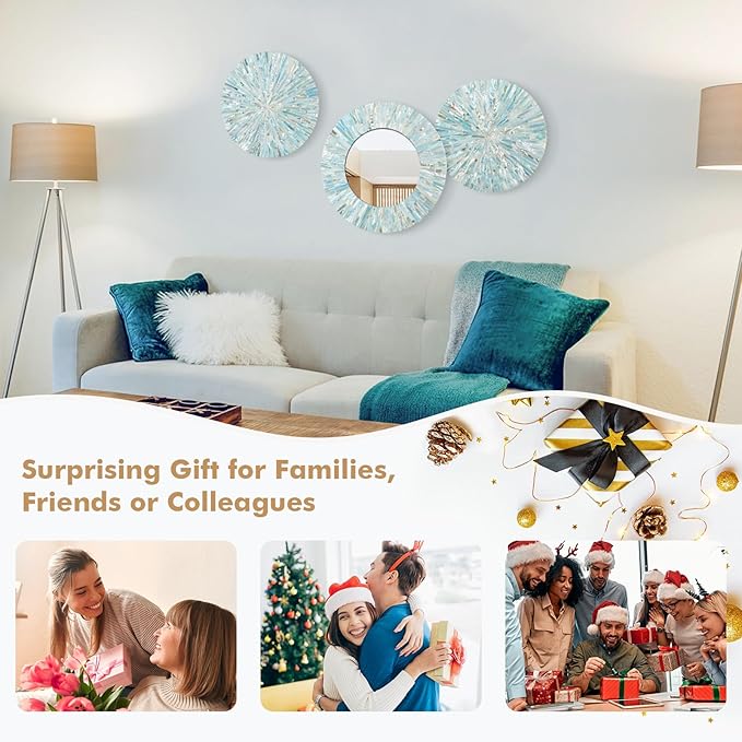 Beach Mirror Wall Decor for Living Room, 3PCS Natural Mother of Pearl Coastal Wall Art Bedroom Bathroom Decoration, Handmade Ocean Round Wall Hanging Sculptures for Home Office Holiday Hotel