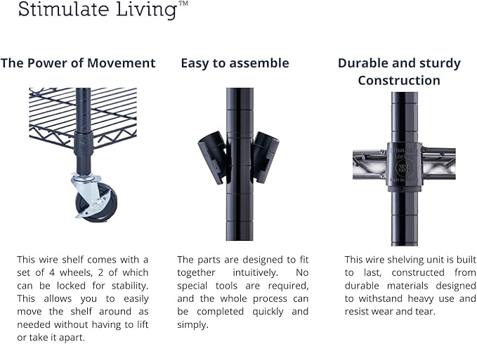 - â EASY ASSEMBLYâ Our Stimulate Living Wire Shelving is designed with simplicity in mind, making assembly quick and hassle-free. You can easily set it up in no time and start using it immediately.