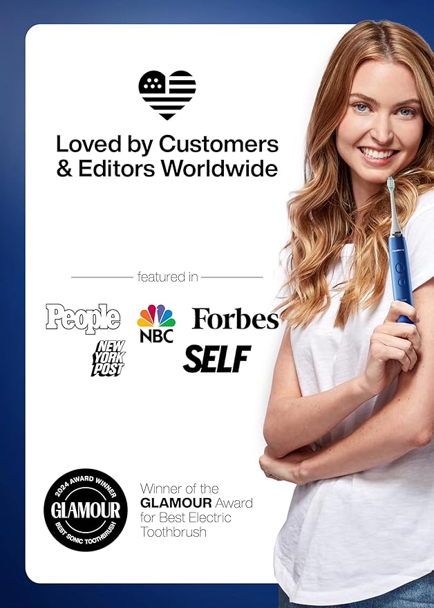 - What's in the Box – 1 Sapphire Blue Smart Toothbrush, 8 DuPont brush heads with protective caps to keep your brush heads clean, 1 custom travel case, user manual, warranty card.