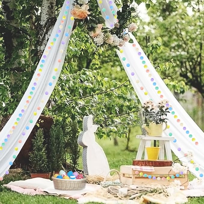 - PASTEL POM POM GARLAND FOR CRAFTS & DIY PROJECTS: Good idea for crafting projects, awesome diy crafts supplies for making colorful pastel rainbow bunting banner with santa gnome, candy cane, snowflake angel star heart. Easter basket decorating supplies, custom backdrop curtains personalized, nice multi colored decorate centerpiece, fuzzy pom pom trim tassel lace ribbon wreath Easter garland, multicolor Xmas tree wrap around garland and more unique novelty handmade decorative accessories.