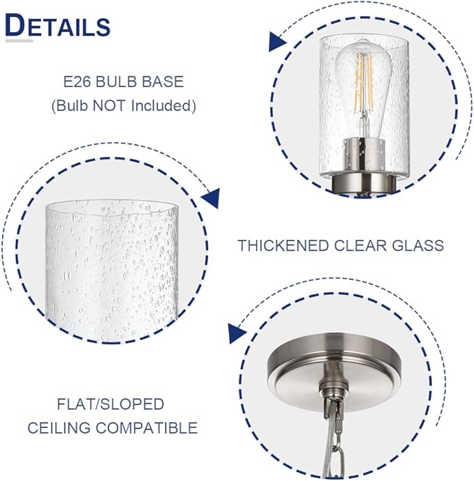 - UNIQUE DESIGN - With the unique designed in metal frame and clear glass cylindric lampshades, this chandelier can give you a flattering illumination.