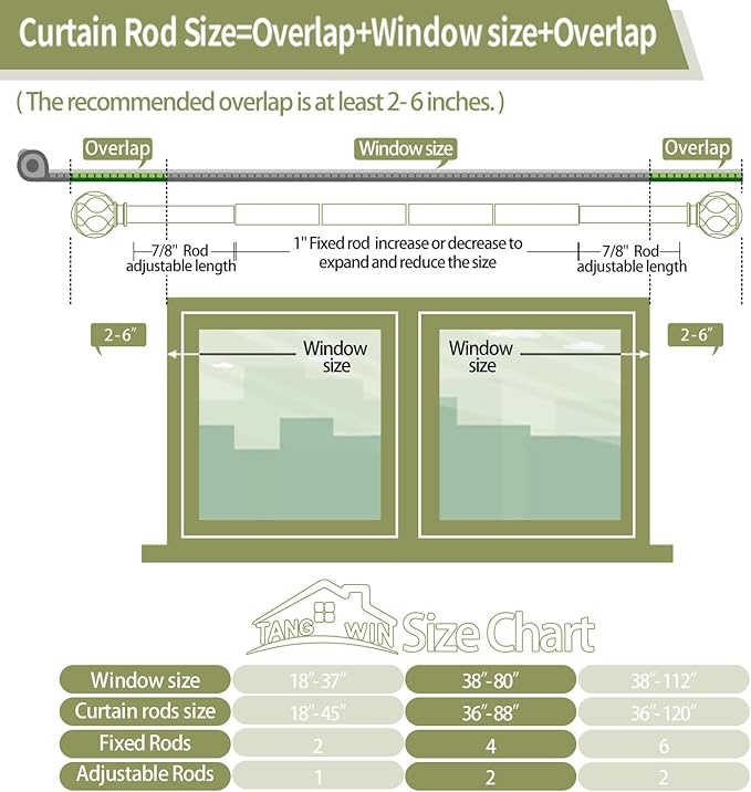 - Curtain Rods for Windows 48 to 84 inch(4-7ft): TANGWIN drapery rods include 4 x 16" x 1" fixed rods, 2 x 16" x 7/8" adjustable rods, 2 x finial,3 x bracket, 3 x connector, 6 x anchor, 6 x screw. Antique bronze curtain rods for windows can extend from 36 to 88 inches, choose the right size curtain rods according to the length of your window.