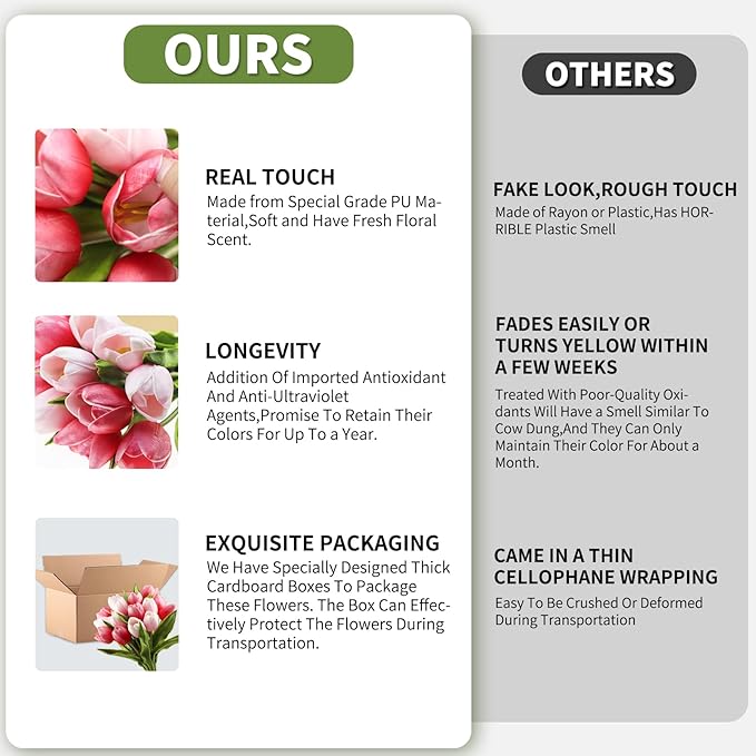 - What sets our tulips apart is their longevity. With the addition of imported antioxidant and anti-ultraviolet agents, these tulips promise to retain their colors for up to a year, ensuring lasting beauty in any environmental condition. Note: Artificial flowers without UV inhibitors will turn yellow within 2 weeks under sunlight, and those treated with poor-quality oxidants will have a smell similar to cow dung or burning plastic , and they can only maintain their color for about a month.