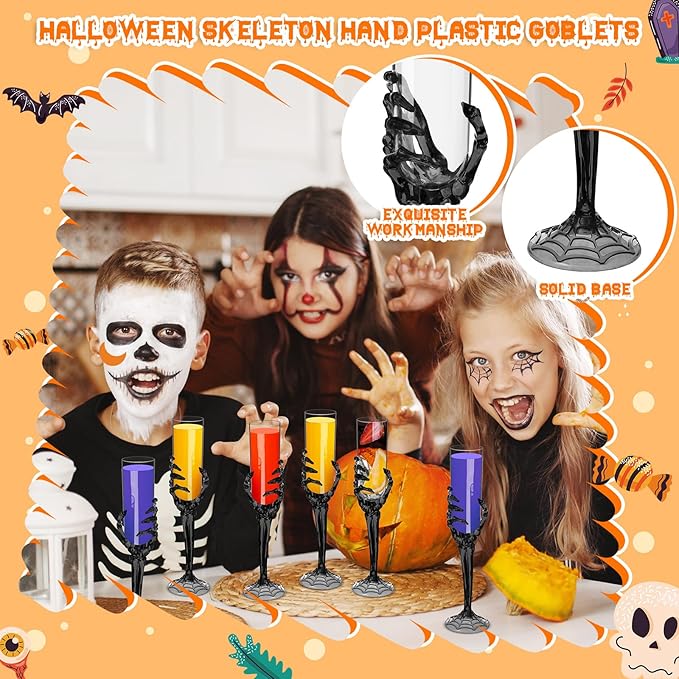 Bokon 48 Pcs Halloween Champagne Flutes Bulk Plastic Stemware Halloween Skeleton Hand Plastic Goblets Creepy Champagne Flute for Party Decoration(Black)