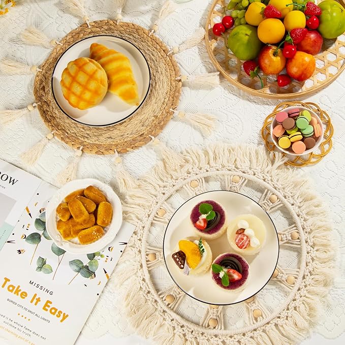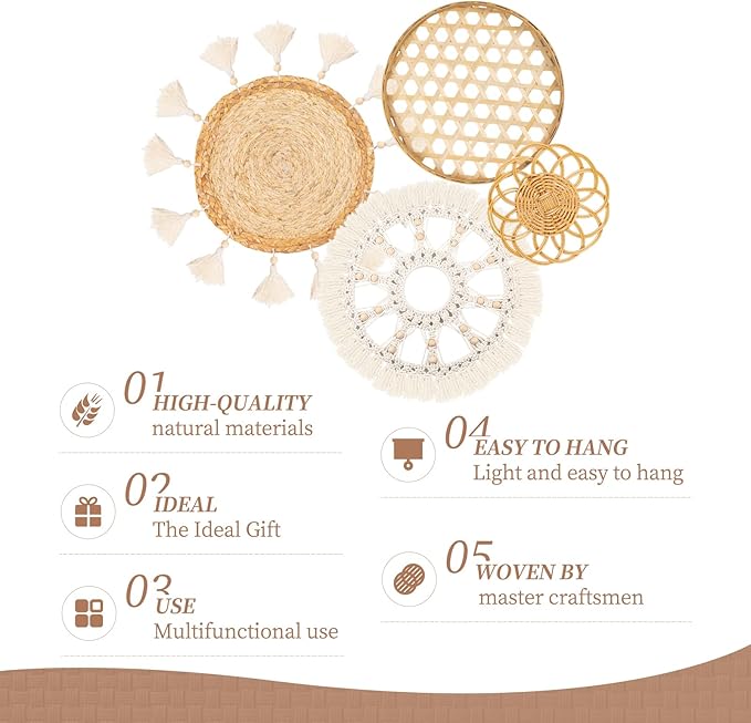 - 【Unique Bohemian Style】: These wall decors feature a unique bohemian style with a flat round woven design, tassels, and elegant macrame details. Add a distinctive touch to any room, creating a cozy and artistic ambiance.