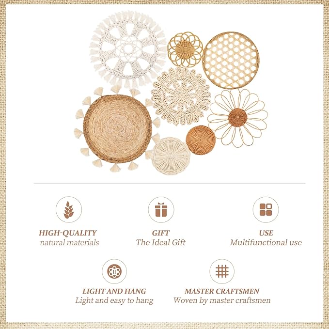 - 【Boho Atmosphere】: These wall decors feature a unique bohemian style, the flat round woven design, combined with tassels and elegant macrame details, adds a distinctive touch to any room perfect for enhancing the atmosphere of your gallery walls, fireplace, wedding backdrops, and bohemian themed parties.