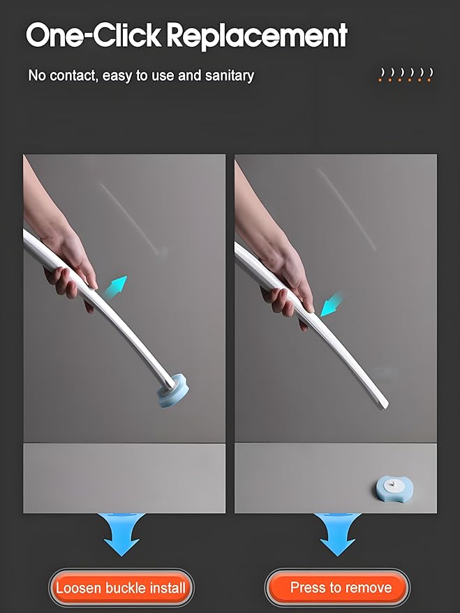 - Easy to Install and Use: Push up the button, attach one refill, pull forward to drop the refill after use, without having your hand touched. No tools, no holes. The toilet bowl cleaner brush and holder can be easily installed without hurting the wall. Please clean the wall before installation, press the adhesive strip firmly, and allow the adhesive strip to fully stick to the wall.
