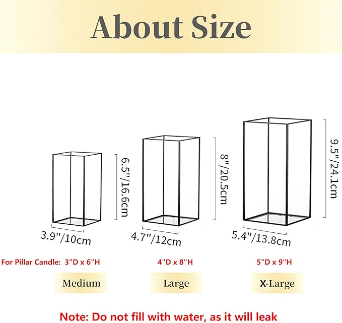 - Exquisite Workmanship -- Our glass hurricane candle holder are made of clear glass and metal frames. Each frame is carefully polished and assembled by hand. The clear glass is not only windproof, but also reflects the candlelight to create a magical and relaxing atmosphere.