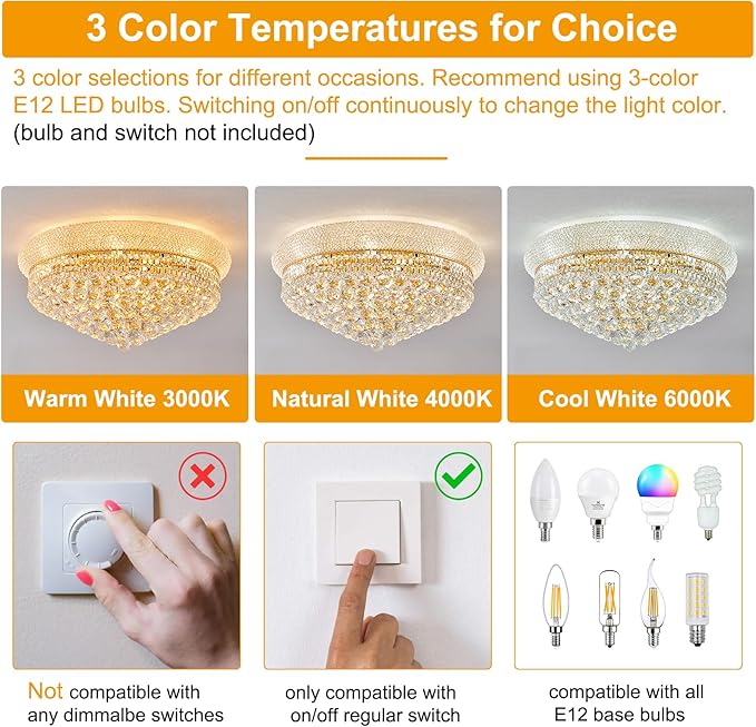 - 【Light Up Your Room】12 x E12 Bulbs (Not included) will be worked well with this empire chandelier. Recommend using 3-color LED bulbs and compatible dimmer switch (Not included). You could choose which color temperature (warm white-3000K / neutral white-4500K / daylight white-6000K) would be fit for yours rooms.