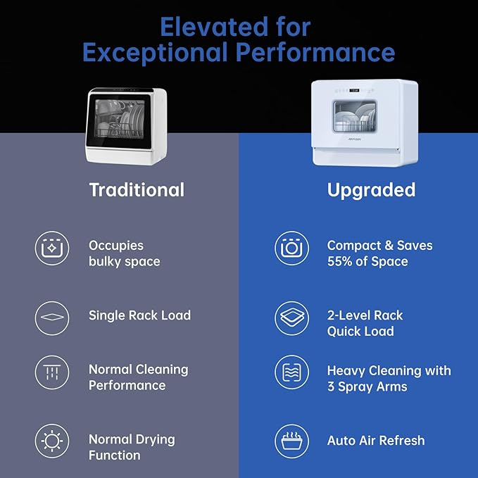 - Sleek Design & High Capacity: A01 countertop dishwasher features a slim profile, saving valuable countertop space. Ideal for small kitchens and families (5-6 people), it can accommodate plates up to 11.8 inches in diameter when the upper basket is removed.