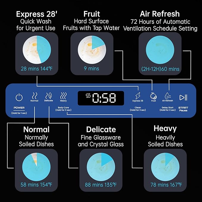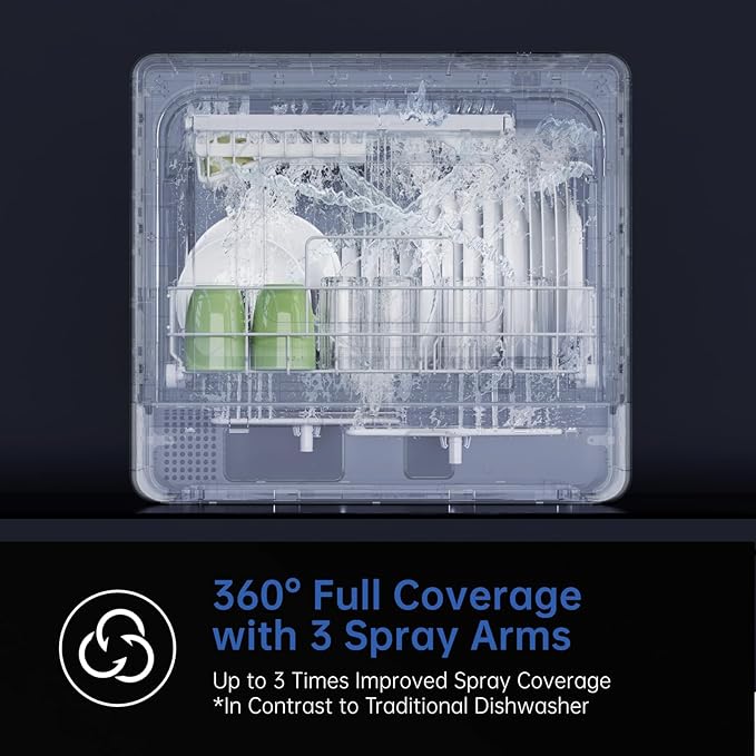 - High-Temperature Cleaning: The mini dishwasher includes a Hygiene Cycle that heats water to 167°F, sanitizing dishes (even baby bottles) and removing tough stains. It also provides 60 minutes of hot-air drying and 72-hour automatic ventilation to keep dishes and the interior dry and fresh long-term.
