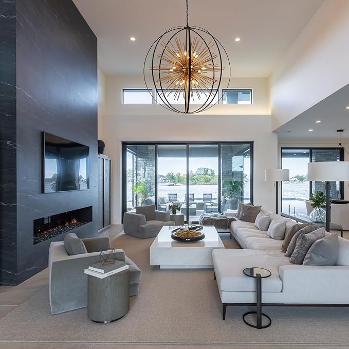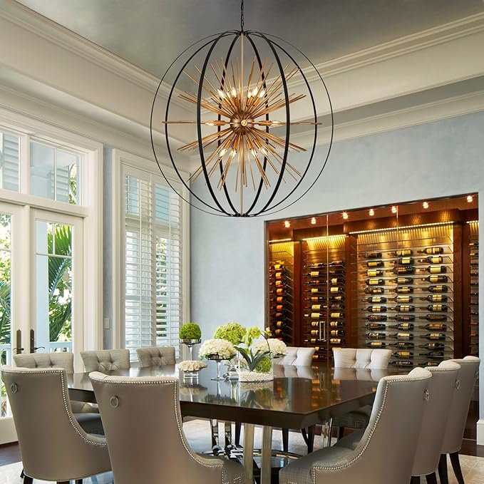 - 【Stunning Firework Design】The Black and Gold Sputnik Chandelier features a captivating spherical body that resembles a preserved firework, creating a striking focal point when illuminated. This Modern Chandelier combines contemporary and vintage elements, making it a perfect addition to various settings such as the living room, kitchen island, dining room, hallway, stairway, entryway, as well as restaurants.