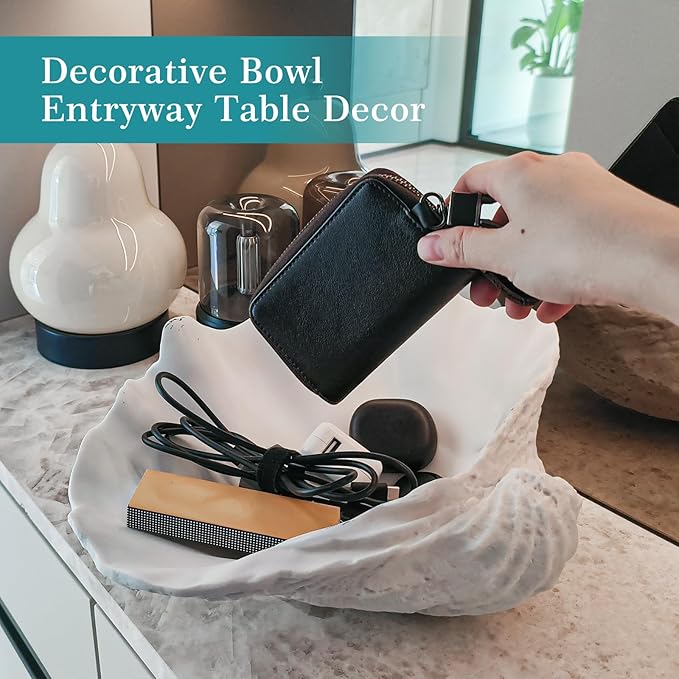- 【Decorative Bowls for Home Decor】The large White clam shell shape decorative bowl design is the present of the nature,Though Faux, this shell looks real of a ocean weathered shell and is very suitable for use as aKey Bowl for Entry Table,Beach Theme Candy bowl,Fruit Bowl for Kitchen