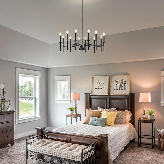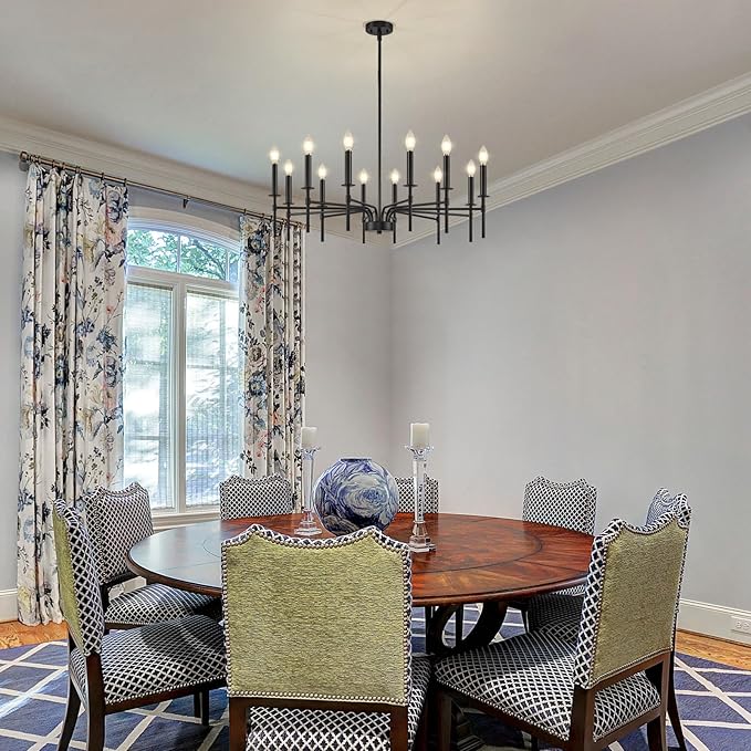 - Dimmable and E12 Bulb Compatibility: With 12 E12 candelabra sockets, this black chandelier is compatible with various E12 bulbs (incandescent, LED, CFL, and halogen, 40W MAX / bulb), offering dimmable functionality to create the perfect ambiance. This black matte chandelier allows for flexible lighting control, making it suitable as a black chandeliers for dining room, or master bedroom chandelier (NOTE: bulbs and dimmer are NOT included)