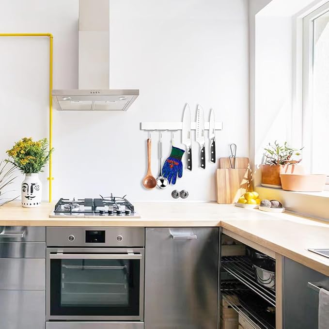 - 【Adaptable Hook】It includes three detachable stainless steel magnetic hooks, each embedded with a powerful neodymium magnet for a secure attachment to the rack. These hooks are designed to hold a variety of non-magnetic utensils alongside your knives. Adjust and reposition the hooks as needed to maximize your storage space, blending functionality with a sleek design to complement your kitchen's aesthetic