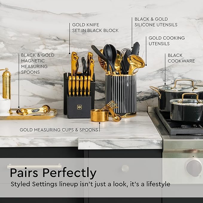 - ✔ ADD GLAMOR TO YOUR KITCHEN WITH THIS COMPLETE GOLD KITCHEN UTENSILS - instantly elevate your cooking and baking experience by adding this 19-piece set of gold cooking utensils, black kitchen utensils, & gold measuring cups and spoons. Contents include a gold spoon, pasta serving fork, slotted gold spatula, kitchen skimmer, gold ladle, black silicone spatula, slotted silicone turner, basting spoon, silicone whisk, gold tongs, gold measuring cups, and gold measuring spoons