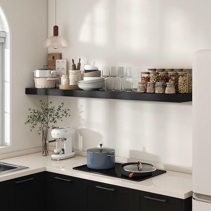 Black Floating Shelves for Wall - 72 Inch Wide x 12 Inch Deep Wall Shelves Set of 1 - Rustic Black Wood Shelves for Living Room, Bathroom, Laundry Room, Bedroom, Kitchen, Home Office