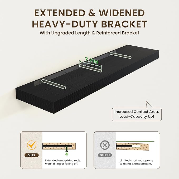 - DEEPER & THICKER SHELF- Our floating shelves measure 72W x 11.6D x 2H, deeper and thicker than usual wall shelves, which create more storage and display space for your home