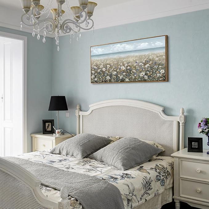 - ➤Bring a Beach Vibe to Your Space: This floral wall art depicts a seashore covered with newly blooming wildflowers Daisy. The upper half of the flower canvas wall art features a blue sky and a calm ocean in pale blue and gray tones for a fresh and breezy look. The lower half of the artwork is covered in a neutral palette of white, cream, and brown to complete this coastal farmhouse piece.