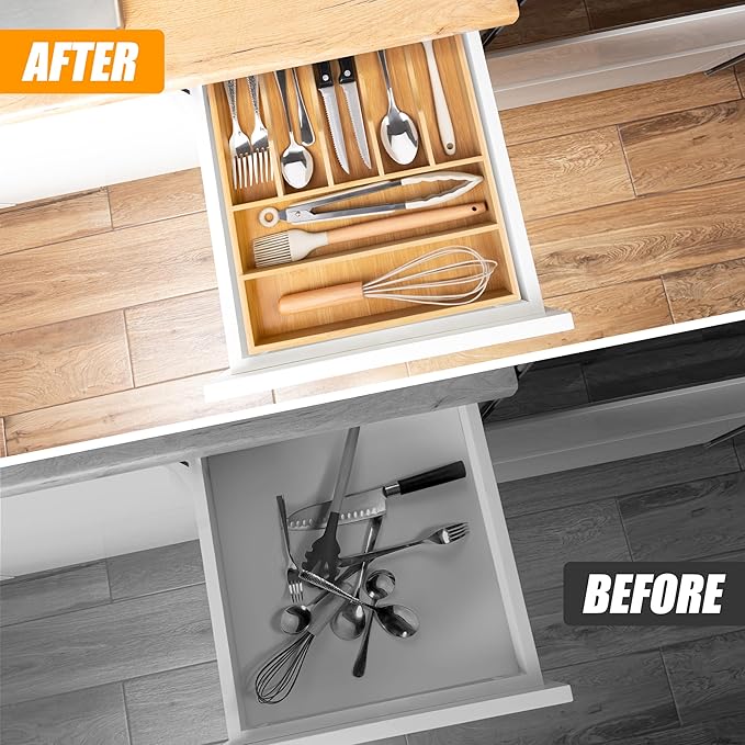 - ✅【Perfect premium bamboo】Our utensil silverware drawer organizer flatware cutlery tray is crafted from natural bamboo that has been grown for over 4 years. Each silverware drawer organizer made of bamboo is meticulously handcrafted by seasoned artisans to ensure a smooth, splinter-free surface. You can confidently allow your family or children to use our silverware drawer organizer. Unlike plastic and metal drawer organizers, our utensil holder is water-resistant and odor-resistant, making it perfect for long-term use.