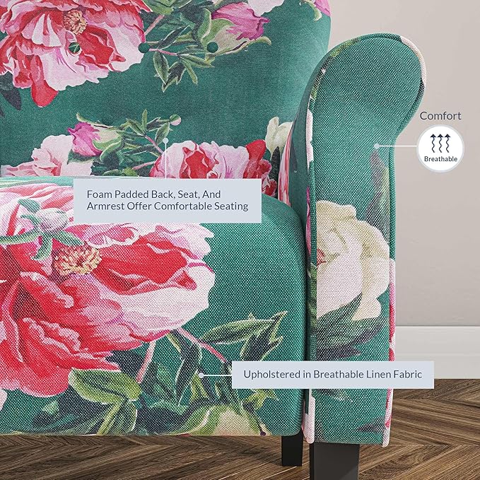 BELLEZE Modern Accent Chair, High Back Armchair, Upholstered Wingback Side Chair, Padded Single Sofa with Wooden Legs for Living Room, Bedroom - Green & Flower