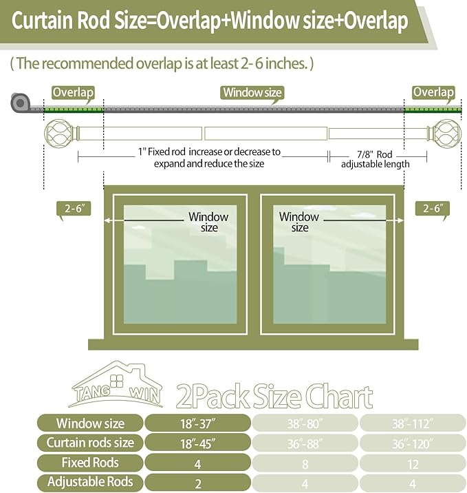 - 2 Pack Curtain Rods for Windows 28 to 48 inch(2.3-4ft): TANGWIN drapery rods include 4 x 16" x 1"fixed rods, 2 x 16" x 7/8"adjustable rods, 4 x finial, 4 x bracket, 2 x connector, 8 x anchor, 8 x screw. 2 Pack wood curtain rods for windows can extend from 18 to 45 inches, choose the right size curtain rods according to the length of your window.
