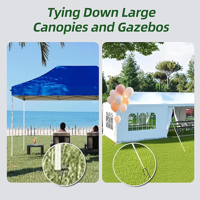 - 【SHARP TIPS】The j hook stakes have a chiseled end to facilitate ground penetration, the metal steel is sturdy and does not deform when hammered into tough ground. These ground stakes are thick and heavy duty and they will not budge in a strong wind.