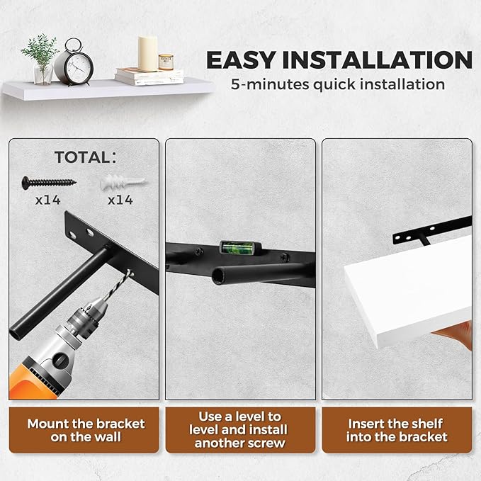 - Stable Floating Brackets: The shelves include hidden steel brackets for secure and wobble-free support. This clean floating look seamlessly blends into any room, whether it’s the living room, kitchen, or office