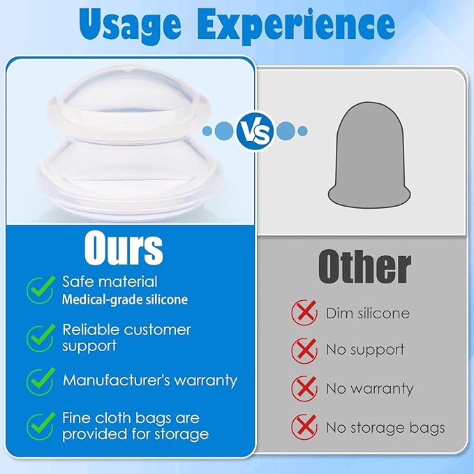 - Include:4 Massage Silicone Cups: Extra Large Cups (3.9”x 3”), Large Cups (3”x2.2”), Medium Cups (2.4”x1.8”), Small Cups (1.8”x1.4”), A delicate flannel bag, Easy to store those cups.