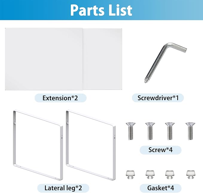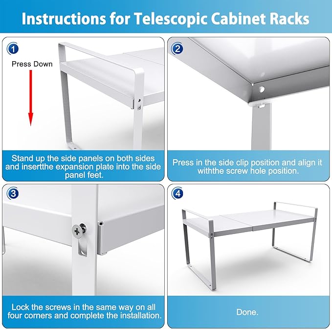 - Easy to Install:Easy to assemble with a clear manual. Comes with accessories and step-by-step instruction, it will be easy for you to install this storage shelves , no drilling needed! We use non-slip suction feet to prevent the countertop organizer from sliding the table.The package includes extension*2 ,lateral leg*2,screw*4,gasket*4 and screwdriver*1